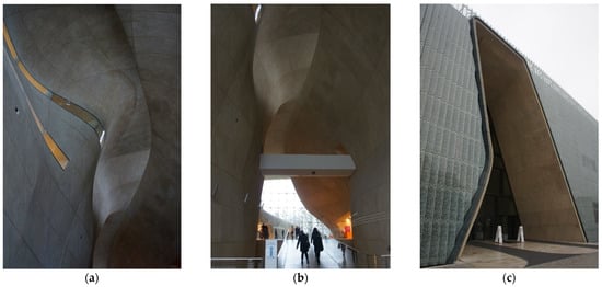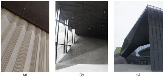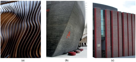 Polish National Radio Symphony Orchestra House, Katowice, 2014, arch. Konior Studio. (a) The inner precast concrete cladding of the main concert hall. Source: M. Charciarek []; (b): The inner cast concrete layered wall of the main lobby, (photo by M. Celadyn); (c): Main entrance. Source: https://commons.wikimedia.org/wiki/File:Katowice_05.15_NOSPR_2.JPG (accessed on 31 May 2021), photo by M. Mróz.