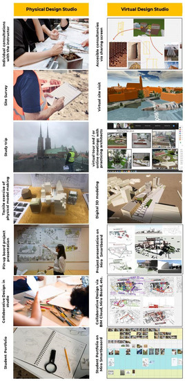 The process of learning to design is the most important stage of architectural education. Therefore, the Design Studio (DS) is still the core element of degree programs at architecture schools [1]. Tokman and Yamacli emphasize that the architectural design studio is an important learning process, “which aims to shape the architectural sensitivities of students and to develop their communicative abilities as well as their problem-solving skills” [2] (p. 245). Put differently, DS can be seen as a class in Bachelor and/or Master Architecture programmes in which learners receive hands-on instruction in architectural design, challenging them to apply all the theoretical knowledge and technical know-how gained from other courses in the programme [3,4,5]. In fact, a design studio is characterized by the absence of a clear distinction between theory and practice [6]. Aa result, the architectural theoretical knowledge and practical skills are obtained through a student-centred learning process of creating a design project, such as an urban space or a specific building [7]. In line with the (socio-)constructivist learning theory, architectural students are supposed to actively (co-)construct or make their own knowledge rather than passively accept information presented by the teacher—e.g., [6,8,9]. By translating this constructivist idea into architectural education, the learning process usually takes place in a flexible physical space that enables various activities such as collaborative or personal work, group discussions, seminars, the tactile exercise of physical model making based on design problems in the real world, student-tutor interactions, pin-up board presentations, and ‘desk crits as well as juries’ [3,5,6,10]. This ‘learning by doing’ approach allows students to develop decision-making capabilities, to explore their own talents, and to refine their own procedure and style of architecture design [6]. In this study, for the case in which a physical place is offered to the students to create a project throughout face-to-face interactions, the term Physical Design Studio (PDS) is used.