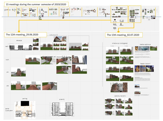 Another virtual tool which was much appreciated by the students is Miro collaborative board. This is a virtual board where students can gather and manage all their drawings, animations, descriptions and comments and can combine them with external references (graphics, movie clips, photos, and website links). Students indicated to like the board as they feel free to compose their work the way they prefer. Additionally, the board offered them the opportunity to collaborate with their colleagues as well as their instructor. The main way in which Miro was used during the VDSs was in the form of a linear project journal. In this journal on Miro, each step of the design process is linked to a specific date. Once all the steps have been inputted into Miro, the students can have an in-depth look into their design process and how it evolved over time (see Figure 4). This so-called visual journal in Miro supported the development of students’ self-assessment, reflection and action planning skills [37,38,39].