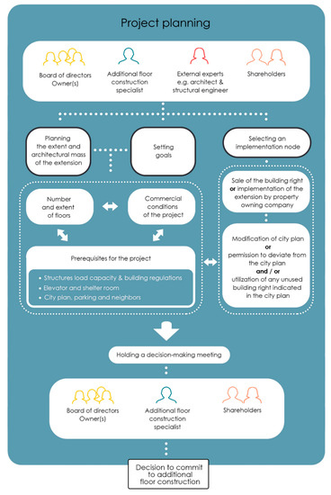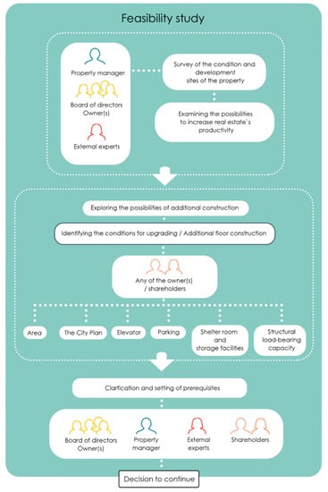 During this phase, the housing or real estate company starts to draw the mass of the additional floors and determines the course of the project with the help of experts as shown in Figure 5. This is strongly influenced by the form of the company of the property owners throughout the project. Real estate companies often build additional floors themselves, while housing companies combine additional floors and shareholders in their own companies and sell the building right to a third-party developer through a share issue.