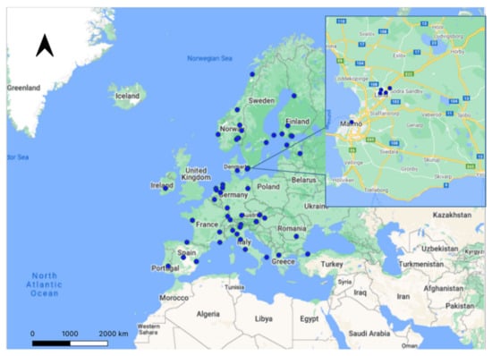 Given that the dataset contains several projects across different cities in Europe, a spatial visualization of the location of these projects was deemed vital. QGIS software (Version 3.10, Open Source Geospatial Foundation, Beaverton, OR, USA) [] is a Geographic Information System (GIS) based open-source software used here to display the cities on a map. Each project is appended with the latitude and longitude of the city it lies in, and these latitudes and longitudes are wrapped over a European base map.