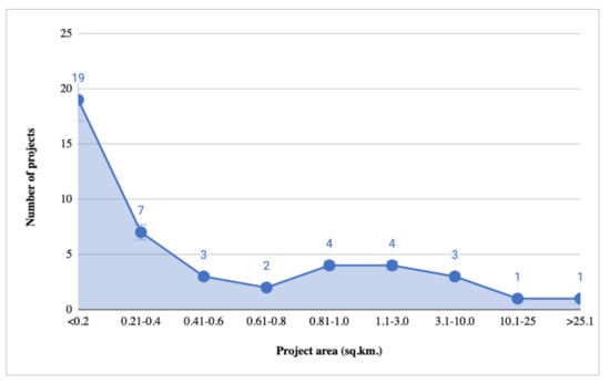 The amount of project area (spatial scale) is counted by considering the installation of the planned energy systems in their locality. These energy systems might be installed on the residential, commercial or industrial roofs, or flat ground-mounted in open fields, or even through the virtual presence of an energy system. From Figure 4, most of the projects, i.e., 19 projects are claimed to be using less than 0.2 km2 area, 7 projects between 0.21 and 0.4 km2 area, 8 projects consuming area between 0.81 and 3.0 km2, and there is one project claim to be consuming more than 25 km2 area.
