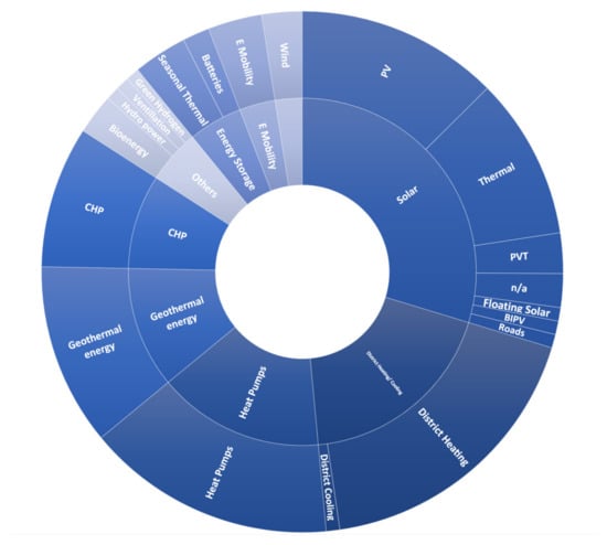 These energy technologies are divided into categories as solar, district heating/cooling, heat pumps, geothermal energy, combined heat and power (CHP), energy storage, wind, e-mobility and others present in the inner circle of the pie chart shown in Figure 7. Solar energy technology is identified to be the primary source of energy supply in almost all projects, specifically photovoltaics (PV) and thermal are the main contributors for producing electricity and heating applications respectively. There are five situations where projects claimed to use solar technology but have not been specific about the type of solar energy. Other new/innovative forms of solar such as hybrid photovoltaic/thermal (PVT), building integrated photovoltaics (BIPV), floating solar and solar roads technologies also have been considered in few projects.