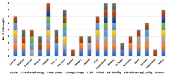 Figure 8 represent the diversity of energy technologies in each country. Solar energy, district heating/cooling and heat pumps technologies are commonly considered in almost of the countries, geothermal energy and CHP plant are being used in nearly half of the countries as represented in Figure 8. Wind energy is integrated in a smaller number of countries such as Denmark, Finland, Germany, The Netherlands and Turkey, and energy storage is only seen in few countries such as Austria, Finland, Germany, Italy, Norway and Turkey.