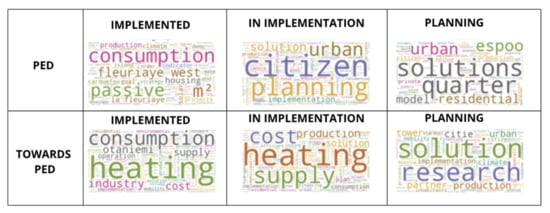 Figure 9 shows the most commonly used words in the project description transcripts according to their classification from Table 2. As seen from the figure, projects that are already implemented (both PED and towards PED) show high use of words like ‘consumption’, ‘passive’, ‘heating’, and ‘industry’. On the other hand, projects that are yet planning (both PED and towards PED) use words such as ‘urban’, ‘solutions’, ‘quarter’, ‘research’, and ‘residential’. Projects that are in implementation (both PED and towards PED) mostly repeat words like ’citizen’, ‘planning’, ‘urban’, heating’, ‘supply’, and ‘cost’. Finally, both implemented and in implementation towards PED projects use heating, cost and supply words.