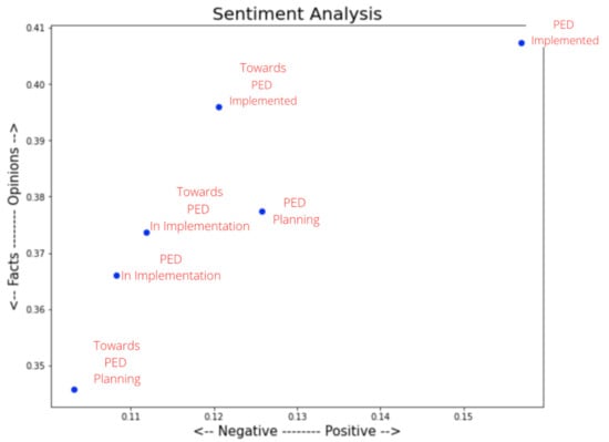 Figure 10 displays the sentiments portrayed by the 6 groups of projects in the context of polarity (positivity and negativity) and subjectivity-objectivity (opinions-facts). In general, PED implemented projects have very positive feedback, reflecting by the text. We see both PED and towards PED implemented projects have higher subjectivity than objectivity, compared to their planning phase counterparts. This could be interpreted as the implemented projects are mostly influenced by diverse factors, such as dynamic data, citizens and other stakeholders, while those projects in planning stages emphasize more on objective learning experience from literature, simulation data and the related estimations.