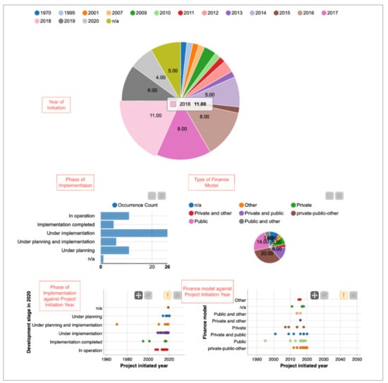 Another visualization technique used to plot the dataset in this project is an interactive dashboard (for non-spatial variables only) developed using the open-source Konstanz Information Miner Analytics Platform (Knime) (Version 4.3.2, KNIME AG, Zurich, Switzerland) []. Variables across the dataset are plotted against each other using interactive graphs and charts, for example, for visualizing the type of financing against the year of initiation of the project, and other such co-relations. Interactive means that a user can click on a project in one plot to highlight characteristics about that specific project in other plots across the dashboard as well.