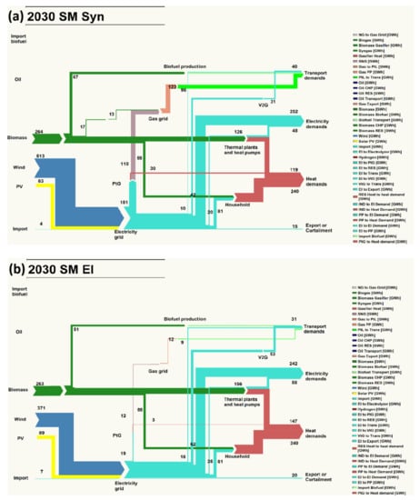 The annual energy flows in the year 2030 at Åland Island towards 2030 target—100% sustainable mobility for two scenarios: (a) SM Syn scenario—domestic production of sustainable fuels and (b) SM EI scenario—high electrification. Reprinted from [].