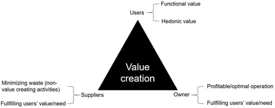 Value creation in a building project depends on three main roles of whom their needs should be assessed: the owner, the suppliers and the users. Haddadi et al. [19] discuss that to create value, the owner’s prerequisite can be summarized in profitable/optimal operation of the building and fulfilling the customer’s needs. Based on the literature on manufacturing processes, the suppliers are required to minimize waste and non-value creating activities, and to fulfil the customer’s (owners and users’) needs to create value in the product they have manufactured. The ultimate objective of the project should then be to fulfil the user’s needs to increase the “customer’s perceived value”. The relationships between the project’s main roles and their requirements that can contribute to value creation are summarized in Figure 1.