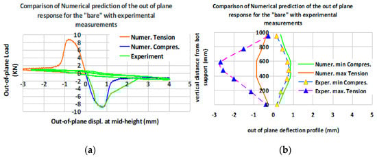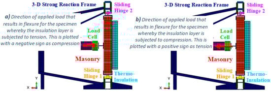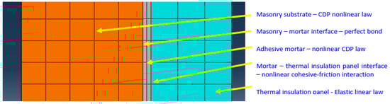 - The employed numerical simulation proposes a multi-stage procedure employing basic information obtained from laboratory testing. Initially, a valid numerical simulation is formed for the “bare” masonry wallet. Next, this numerical simulation is extended to include the thermo-insulating attachment, utilizing in the subsequent non-linear analysis the obtained in the laboratory mechanical properties of the adhesive mortar and the thermo-insulating materials and their interaction. In this way, the non-linear analysis included realistic constitutive laws describing the interaction between the adhesive mortar interface with the masonry substrate and with the thermo-insulating panel-units. This procedure is of a general nature and can be employed for applications addressing different masonry or thermo-insulating materials.