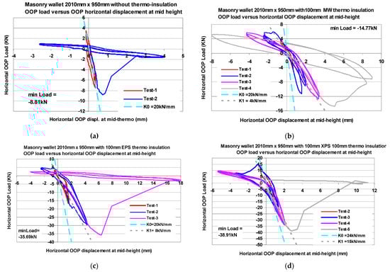 - In contrast, all three specimens with thermo-insulation required a significant increase in the load and displacement amplitudes in order to reach the peak load beyond which a similar brittle behavior follows (4–8 loading cycles, Table 4). Until this peak “compressive” load is reached the subsequent loading cycles demonstrate a decreased stiffness (K1 = 15–5 kN/mm), compared to the K0 initial stiffness, together with load-displacement cycles with energy dissipation characteristics. The same can be observed but to a lesser degree when the load direction is reversed (“tensile” load). This must be attributed to the interaction of the thermo-insulation with the crack formation of the masonry substrate as well as the partial debonding. The ratio of the mid-height displacement for peak load over the corresponding “assumed yield” displacement increased from approximately 1.4 for the masonry wallet without thermo-insulation to approximately 2.0 for the wallets with XPS thermo-insulation and to approximately 3.0 for the wallets with either EPS or MW thermo-insulation (Table 4).