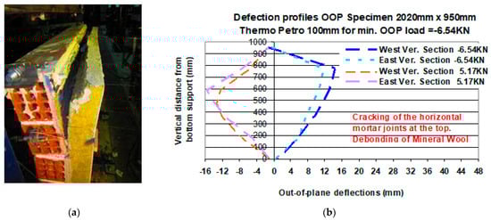 - In all tested wallets, the presence of the thermo-insulating material did not alter the initial dominant flexural failure mode which, as expected, was the formation of horizontal cracks at the bed-joints near mid-height. This flexural response mechanism was accompanied in subsequent load cycles by the debonding of the insulating panels from the masonry substrate at the top and bottom horizontal boundaries of the tested specimens. In all cases, this debonding occurred for relatively large values (approximately more than 5 mm) for the out-of-plane displacements at mid-height of each wallet. For such large out-of-plane deformations the corresponding flexural capacity was significantly reduced.
