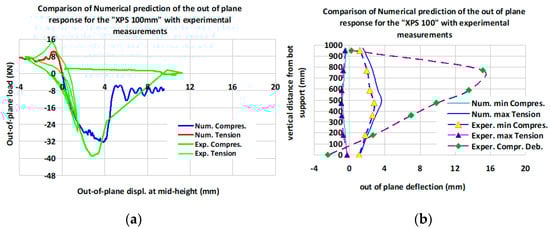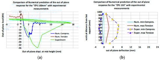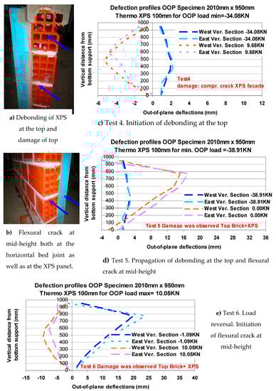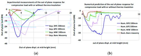 - These thermo-insulating attachments, being under flexural tension, results in values of the out-of-plane displacements for peak compressive load significantly larger (XPS 3–6 mm, MW and EPS 5 mm) than those measured for the specimen without any thermo-insulating attachment (“bare”, 2 mm).