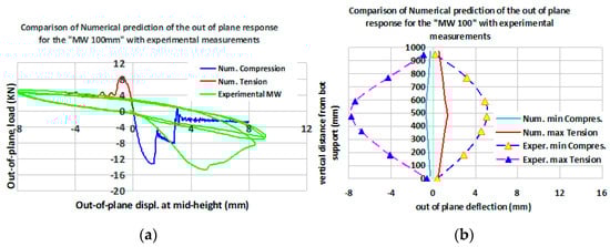 - In all cases the measured out-of-plane flexibility of the tested wallets was larger than the one resulting from the numerical predictions. This is evident in all figures where the measured out-of-plane response is compared to the corresponding numerical predictions. This is also evident from the listed displacement values at peak load listed in Table 7 and must be partly attributed to the fact that the numerical analyses did not simulate the cyclic load reversals of the loading laboratory sequence and the corresponding gradual accumulation of micro-cracking and plastic deformations that occurred during the experiments. This issue is currently under study.