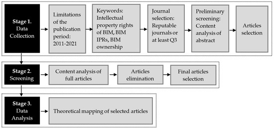 According to [34], it is important to conduct a review of previous studies, because a study must be based on existing studies. Therefore, in this study, after the conceptualization stage of research, we reviewed previous studies that discuss the ownership of models and the IPR model of BIM. The literature review process that was established in this study was adopted from several previous studies, including those by [35,36,37]. The stages of literature review in this study can be seen in Figure 1 below.