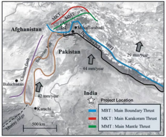 Figure 1. General tectonic setting of Pakistan and tectonic plates movements [3]. The major faults along with active belts surrounding the project are displayed.