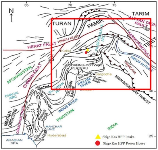 The project is located in the vicinity of active faults, as shown in Figure 1. The study focuses on the area denoted by the red rectangle in Figure 2, which includes Pamir, Hindukush, Northwest Himalaya, the Axial Belt, and the northeastern Karakorum block. Pakistan is located near the junction of the Indian and the Eurasian plates. The repeated earthquakes in Pakistan and the surrounding area are consequences of the collision of these two plates, resulting in the formation of the Himalaya, Karakoram, and Hindukush Mountain ranges due to compression and uplift. The Indian plate is being subducted under the Eurasian plate. The movement of the Indian plate towards the north is occurring at 4–5 cm/year [37]. The resulting collision has splintered the Indian plate into several segments beneath the Kashmir basin [38]. The folding and thrusting of the upper plate produced some major faults in the surrounding areas, and include the main Karakoram thrust (MKT), the main boundary thrust (MBT), and the main mantle thrust (MMT), which are shown in Figure 1 and Figure 2 along with major belts. The western branch of the Hazara Kashmir Syntax in the MBT zone was the source of the October 2005 Kashmir earthquake [39].