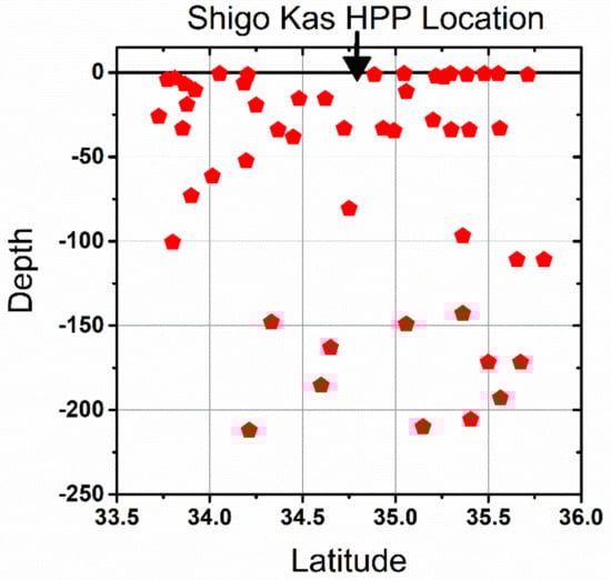 Figure 5. Focal depths in a N–S section through the Shigo Kas HPP site with a distance of 150 km on either side from the intake location.