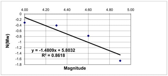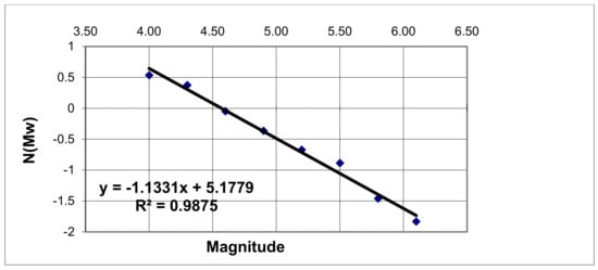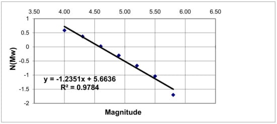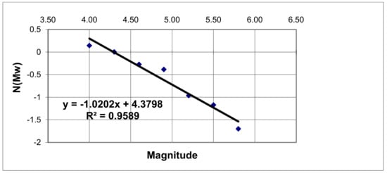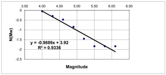 where N ( M W ) is the number of events with a magnitude equal to or greater than   M W , and a and b are seismic coefficients. The seismicity of a zone is measured by parameter a, which varies from zone to zone, whereas the b value shows the relationship between the number of small and large earthquakes in a zone. A high b value is related to a high number of smaller earthquakes in relation to larger ones.