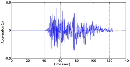 Furthermore, the records from the TCU078 (N-S and E-W) station are best suited for our case, as this station is just 5 Km away from the source, and our project is also a few Km away from the potential fault line of MMT. Therefore, the Chi-Chi 1999 (TCU 078 NS and EW) earthquake record form the PEER database [55] has been selected based on the guidelines of [56]. The acceleration time history of Chi-Chi (TCU 078) is shown in Figure 11. Due to the effects of the rocky strata, the overall amplification was not so considerable, and therefore was ignored.