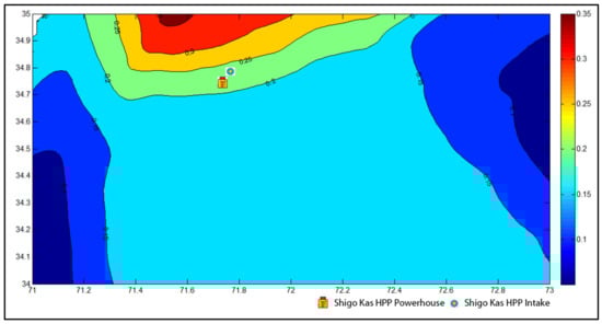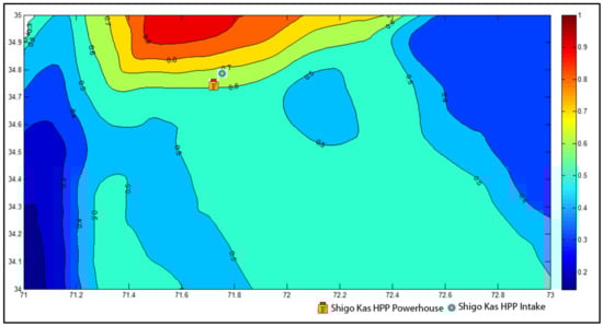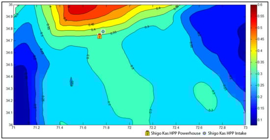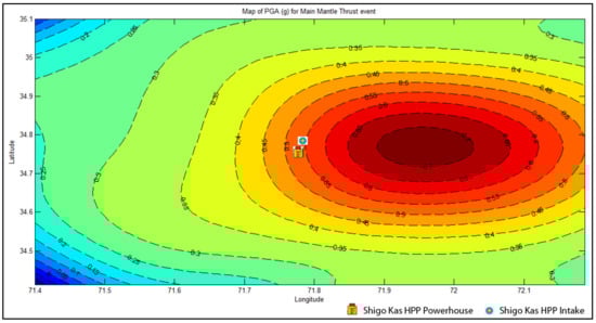The main main mantle thrust (MMT) in our case, with a potential of 7.8 Mw, has been determined for the Shigo Kas HPP site. The coordinates of the nearest point on the projection of the fault were used as the epicenter, which are (34.77° N, 71.96° E). The shear wave velocity at the bedrock was taken as 1200 m/s. The PGA value obtained at the intake and powerhouse locations is 0.50 g. The scenario hazard map developed for the study area is shown in Figure 12.