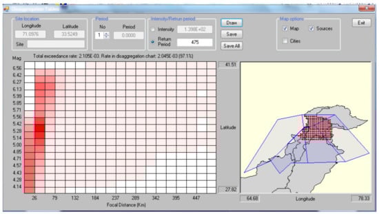 To understand exactly how distance and magnitude range contribute to the PSHA, it is the most important step in PSHA to perform the de-aggregation. PSHA does not consider specified individual earthquakes, but rather takes into account all the possible earthquakes that could occur and determines the rate at which different ground motion parameters can be expected to be generated at the site as a result. De-aggregation is the decomposition of the total hazard of a site into many single scenarios, in order to determine which scenario contributes significantly to the hazard of a particular location. As in PSHA, the total hazard at a site gives the combined effect of all magnitudes and distances on the probability of exceedance of a given ground motion level due to different seismic sources, and it becomes very difficult to know whether source, magnitude or distance contributes the most to the hazard, and hence de-aggregation is conducted. The de-aggregation is performed in CRISIS 2007 software for PGA at the rock sites, and a return period of 475 years for both BA08 and CB08 attenuation relationships. The de-aggregation results are shown in Figure 13 and Figure 14. According to the BA08 model, earthquakes with a magnitude of 5.9 Mw to 6.5 Mw and at a distance of 30 to 70 Km from the source are considered as a governing scenario of maximum hazard. On the other hand, the CB08 attenuation de-aggregation results suggested earthquake ranges from 5 Mw to 5.6 Mw for a distance from the source of 30–50 Km.