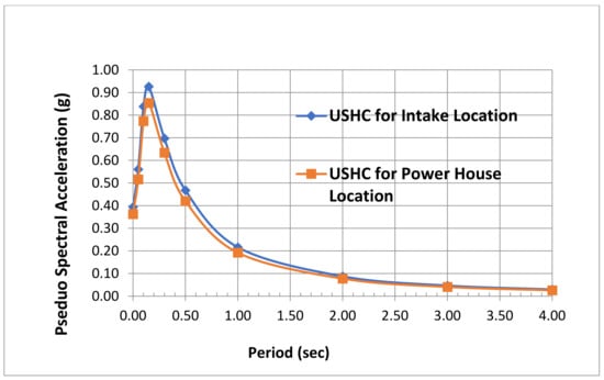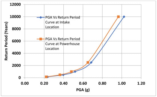 In the current study, PSHA has been performed using the CRISIS 2007 software developed by [61]. The software requires the study area maps in a shapefile format, the seismic sources and their seismicity, the attenuation model used, and the return periods for which the analysis is required. The BA08 and the CB08 attenuation models were prepared in a tabular format in CRISIS 2007. The analysis was performed, and PGA values for return periods of 145, 475, 1000, 2500 and 10,000 years were determined. The PGA value for the 475-year return period (10% probability of exceedance in 50 years) is 0.35 g and 0.30 g at the intake and powerhouse locations. This is slightly higher than the previous studies of [23,34,35]. The relatively higher value is due to the influence of MMT, which is 1.5 km away from the intake site.