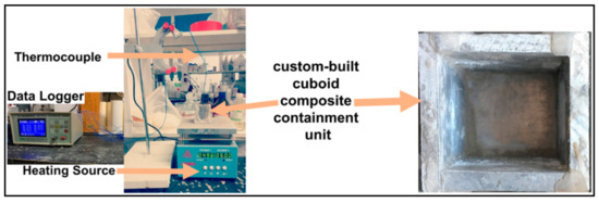 Thermal composites were experimentally optimized through filter-based thermal annealing tests and transient thermal analysis. In the filter-based thermal annealing method, the filter paper was set on the heater, furthermore, 10 g of the thermal composite was uniformly spread on the filter paper. The heat is maintained for 1 h by setting heater temperature at 50 °C, which is sufficiently higher than the melting temperature of OD. Transient thermal analysis was conducted with help of a custom-built cuboid composite containment unit of 40 mm × 40 mm × 50 mm (W × L × H), made up with aluminum, see Figure 1, which is capable of containing around 40 g of thermal composite. After tightly filling the thermal composite in the containment unit via hand-compression, a T-type thermocouple was inserted in the middle (from all directions). The filled containment unit was set on the heater with a constant temperature of 50 °C, and the temperature–time data were recorded through a data acquisition system (SH-X). In addition, morphological inspection via scanning electron microscopy (ZEISS SE2), specific heat, latent heat and melting temperature measurement via differential scanning calorimetry (NETZSCH DSC 214) and thermal conductivity measurement via transient plane source method (Hot Disk TPS2500S) were included.