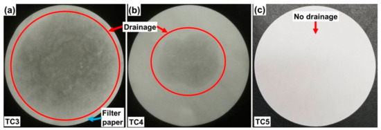 Filter-based OD drainage test of (a) TC3, (b) TC4 and (c) TC5. The red-encircled area depicts the drainage.