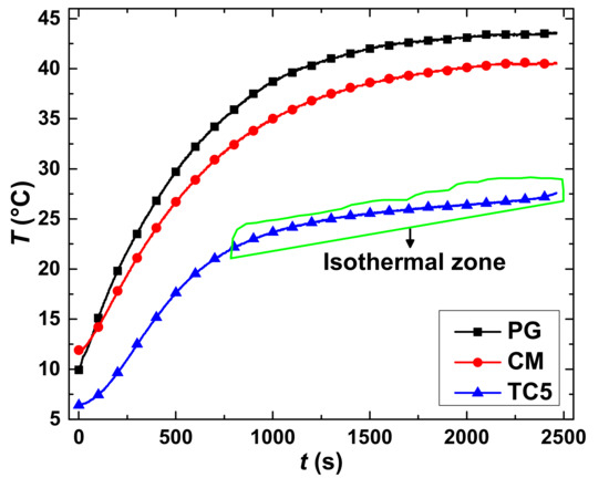 - TC5 shows sufficient temperature retardation as a prominent isothermal zone appeared that lasted for around 1500 s in the case of TC5. The total time to reach the discomfort temperature zone for TC5 is also prolonged by more than 3000 s compared with 400 s of sole PG and CM.