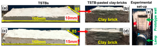 (a) TSTB10, (b) TSTB10-pasted clay-brick, (c) TSTB15, (d) TSTB15-pasted clay-brick, and (e) Prototype wall and experimental setup for thermal analysis.