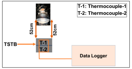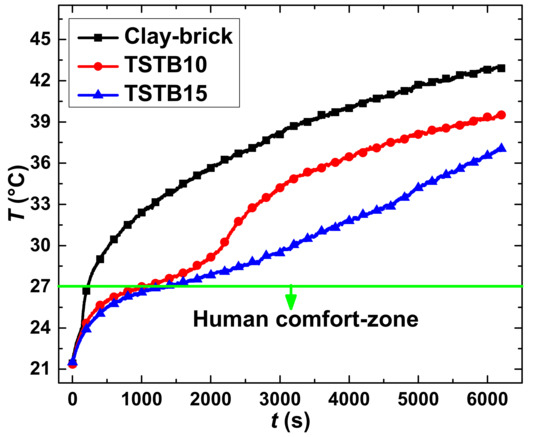 The constant temperature of 50 °C was maintained at the prototype wall by a high-temperature lamp that is placed at an axial distance of 520 mm. Two thermocouples (T-1 and T-2) were inserted into the TSTBs by making a small hole of 1.5 mm. Furthermore, these thermocouples were attached with the data acquisition system (SH-X). A schematic layout diagram of the transient thermal analysis of the brick is shown in Figure 5. By implementing the heat source temperature of 50 °C, the objective is to investigate the worst scenarios of the hottest summer days, for example, of the Asian and Gulf regions. Thermal analysis of the clay-brick is presented in Figure 6 by black color curve, demonstrating the fast-uprising temperature that approaches the upper limit of the comfort zone (27 °C) in just 100 s. It implies no temperature control with the clay-bricks working under sensible heat transfer mode where the relatively high thermal conductivity of clay-brick ingredients (that is, ~0.5 Wm−1K−1) contribute to accelerating the temperature. Therefore, the need for temperature control is necessitated. In contrast, the TSTBs represent a completely different temperature trend. All TSTBs undergo a slightly non-linear temperature trend under sensible heat transfer mode in the beginning, followed by an isothermal zone consisting of latent heat mode. In TSTB10, the isothermal zone is quite apparent which is ascribed to the small thickness, inducing the quick thermal response based on which the phase change region is crossed sooner. Consequently, the temperature retardation time conforming to the human comfort zone is around 1200 s, providing better temperature control capacity compared with the clay-bricks. In TSTB15, the isothermal zone is large with a slower thermal response due to the large thickness, which is therefore highly fruitful in extending the temperature retardation time to around 1600 s. The overall reasons for the effective performance of the TSTBs are thus attributable to the optimal percent contents of the OD, its latent heat and the low thermal conductivity of the composites. Since the more percent contents of paraffin waxes are not allowed in the TSTBs, the only viable option to maintain the large temperature retardation durations is the large thickness of PCM-based bricks depending on the application suitability.