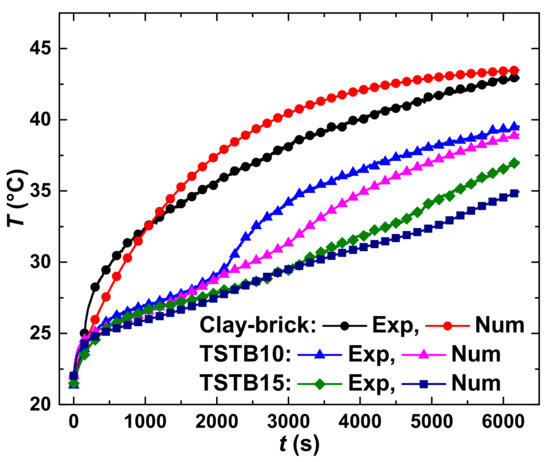 The results of numerical analysis and their validation through experimental results are demonstrated in Figure 8. The slight discrepancies between numerical and experimental solutions, particularly for clay-brick, are ascribed to the factors contributed by the surroundings and heat losses. For the qualitative comparison of numerical and experimental results, a t-test at equal and unequal variances was performed. The obtained p-values come out to be 0.0043 for clay-bricks, 0.0063 for TSTB10 and 0.0031 for TSTB15. The obtained p-values strengthen the argument that experimental results have a good match with the numerical results since the p-value of less than 0.05 suggests no significant difference for the compared entities [37]. Overall, a good match was obtained for clay-bricks and TSTBs.