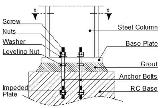Low- and medium-rise steel structures are widely used all over the world as industrial buildings, stores, schools, markets, and warehouses. These types of buildings are commonly used because of their low cost and quick fabrication and construction. Reactions of columns (moment, shear, and axial forces) are transferred to foundations through their bases, which can be pinned, semi-rigid, or fixed connections. The moment distribution, as well as lateral drifts in columns, are changed according to the shape of the base plate connection. For low-rise buildings, pinned base plate connections (see Figure 1) with assumptions of no moment are commonly used because of the smaller values of the lateral drifts. Moreover, the required foundation sections for these connections are smaller. On the other hand, using semi-rigid base plate connections as pinned connections by neglecting their rotational stiffness leads to larger lateral drifts than the actual values. Therefore, the semi-rigid base plate connections should be defined with the actual rotational stiffness. Moreover, the pinned connections act as semi-rigid connections and can transfer part of the applied moment to foundations by exhibiting rotational stiffness resistance. During design, the rotational stiffness of the pinned and semi-rigid base plate connections is ignored in single-story low-rise buildings []. The prediction of this rotational stiffness is more complicated due to various factors such as the bond between the anchor bolts and concrete base, the stress concentration on concrete under the compression flanges of columns, and the behavior of the grout bed under the steel base plate.