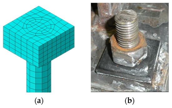 The eight-node fully integrated brick element, C3D8, was used to model the components under the effect of bending. These components include the base plate, anchor bolts, washers, and nuts. The loading plate, grout, and reinforced concrete base were mainly under the effect of bearing stress. Therefore, the solid element C3D8R with reduced integration was used to model these components. The steel column was represented with general-purpose four-node shell elements, C4R, with reduced integration. This element is suitable to model each of the two flanges and web of the column if local buckling is not required []. Two nodes truss element, T3D2, with linear displacement was used to simulate the steel reinforcement bars embedded in the concrete base. The steel column, loading plate, and base plate were simulated as one unit with different material properties for each part because they are welded together. Moreover, the reinforced concrete base and grout were simulated as one unite because of the strong bond between them [,]. Figure 2 shows an illustration of the FE model as one-half of the connection with a plane of symmetry passing through the column web thickness. Each of the anchor bolts, including the nuts and square washers, was modeled as one part. The square washers and nuts are simulated as thick square plates, as shown in Figure 3.
