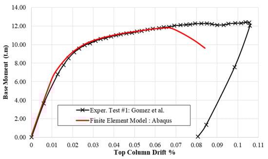 Two validations were conducted for two specimens with the same dimensions and materials but under the effect of two different loading protocols, monotonic and cyclic loading, tested by Gomez et al. [].