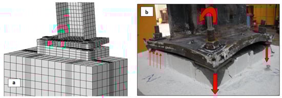 Modes of failure of the base plate: (a) FE model and (b) experimental test.