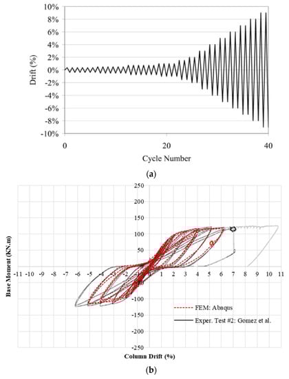 Validation of the second specimen: (a) cyclic loading protocol and (b) base moment vs. column drift for the FE and experimental results.
