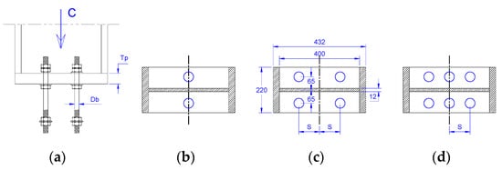 An extensive parametric study was performed using the validated FE model to provide perfect descriptions and determine the elastic rotational stiffness, moment resistance, and energy absorption of the base plate connections. The parametric study investigated four variables for each specimen: the number of bolts (B), the diameter of anchor bolts (D), the distance between the anchor bolt and the center line of the base plate (S), and the base plate thickness (T). The steel column in each specimen was supported by a reinforced concrete base and under the effect of an eccentric compressive axial load. This effect was represented by axial concentric compressive and lateral loads. Each specimen was labeled with a unique name to cover all studied parameters, i.e., specimen (B4-D18-S050-T24) can be defined as follows: the number 4 in B4 refers to the number of anchor bolts, where the number of anchor bolts varies from two to six, as shown in Figure 8; the number 18 in D18 refers to the anchor bolt diameter in mm, where the anchor bolt diameter varies from 12 mm to 30 mm; the number 050 in S050 refers to the spacing between the anchor bolt and the center line of the base plate (see Figure 8c,d), where the spacing varies from 0 to 150 mm to represent 0%, 25%, 50%, and 75% of half of the steel column depth; the number 24 in T24 refers to the abase plate thickness in mm, which varies from 12 mm to 30 mm.