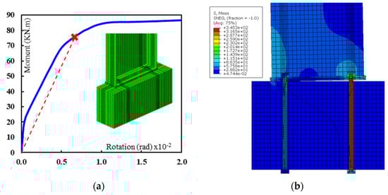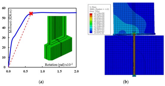 This specimen was tested under the effect of cyclic loading following the cycle curve protocol, as shown in Figure 7a []. The material kinematic hardening model was defined for the plates, anchor bolts, and anchor bolt with one plate washer at the top. The contact between the washer plate and base plate allows separation to take into consideration the effect of the washer plate under the base plate during the reversible loading. Figure 7b shows a good agreement between the FE and experimental results in terms of the base moment and column drift.