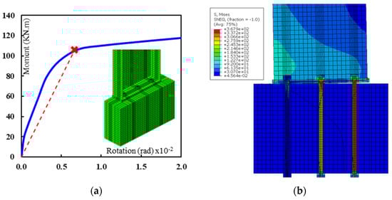 Figure 10, Figure 11 and Figure 12 show the moment rotation curves, deformed shapes, and von misses stresses at the drift level of H/150 for analyzed specimens with different bolt numbers and arrangements. The base plate thickness and bolt diameter were kept constant for comparison purposes. The maximum rotation was selected to be 0.02 rad. because the current study aims to explore the rotational stiffness at the elastic region. For the same number of bolts, the rotational stiffness increased by 6.67% when the spacing between bolts increased from 100 mm to 300 mm (see Figure 11a and Figure 12a). Moreover, an incredible improvement in the rotational stiffness was obtained when the number of bolts increased from four to six at the same spacing (31% increase). These results confirm that the bolt arrangement plays a vital role in controlling the rotational stiffness of the base plate connections.
