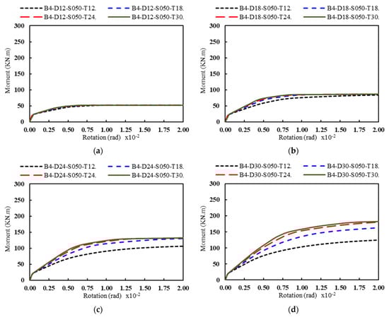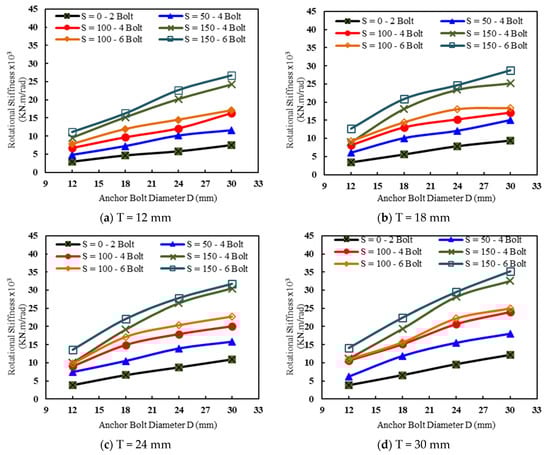 Effect of the base plate thickness (T) on the rotational stiffness for different anchor bolt diameters (D): (a) D = 12 mm, (b) D = 18 mm, (c) D = 24 mm, and (d) D = 30 mm (four anchor bolts and S = 50 mm).