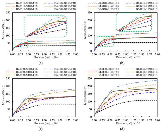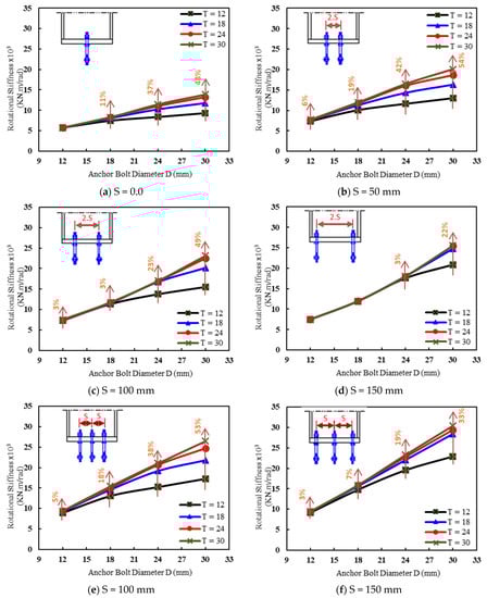 Effect of the anchor bolt number and spacing (S) on the rotational stiffness for different anchor bolt diameters (D): (a) D = 12 mm, (b) D = 18 mm, (c) D = 24 mm, and (d) D = 30 mm (the base plate thickness of 18 mm).