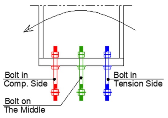 To investigate the rotational behavior of the pinned base connection, the elastic rotational stiffness, moment resistance, and energy absorption are calculated and listed in Table 3 for each analyzed specimen at the drift level of H/150 []. The tension force in each of the anchor bolts is also listed in Table 3. Figure 16 shows the anchor bolt arrangement according to the direction of the applied moment.