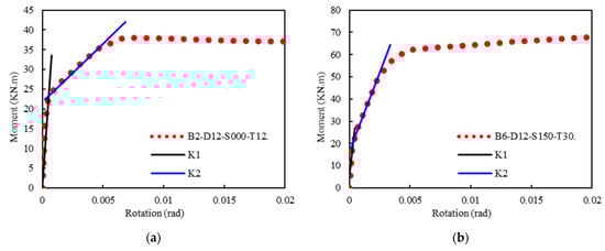 The inelastic behaviors of the specimens were investigated by creating four piecewise linear best fit to the moment–rotation envelopes [], as shown in Figure 17. The piecewise linear response fitting of specimens B2-D12-S000-T12 and B6-D24-S150-T30 are shown in Figure 18. In the first branch, the stiffness K1 is determined by the elastic rotational stiffness. However, the best fit that minimizes the error between the idealized curve and the envelope obtained from the FE results is used to determine the parameters K2 (see Figure 17).