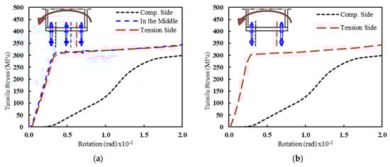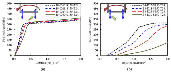 Tension stresses in the anchor bolts vs. rotation for specimens with T = 24 mm, D = 18 mm, and S = 150 mm. (a) B4-D18-S150-T24 and (b) B6-D18-S150-T24.