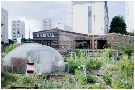 Contemporary examples of estate farms are the AgroCité (2014) in Paris, the MUFI (2011) in Detroit, and the Urby Staten Island (2016) in New York. The first two are managed by the local community. The AgroCité farm was developed during the R-Urban project conducted by the architectural studio Atelier d’Architecture Autogérée (AAA) between 2010 and 2014 [56]. The project included studies on the cooperation strategies between grassroots initiatives related to organic and urban agriculture. The AgroCité farm was established on vacant lots in the urban quarter of the Colombes district in Paris (Figure 4 and Figure 5) [57]. Between March and April 2018, the AgroCité farm was shifted to a lot located in the neighboring district of Paris, i.e., Gennevilliers.