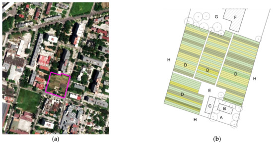 Organopónico La Sazon (Havana): (a). Location of the La Sazon farm in Havana [original study, based on: www.google.pl/maps, (access on 16 August 2018)]; (b). Scheme of the La Sazon farm. Explanation: A—entrance area (public space), B—market (store), C—storage room, D—crop beds, E—utility space, F—residential building, G—recreation area in a residential area, H—roads.
