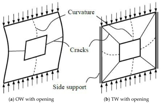 When an opening is created in a wall subjected to loads, the wall will react differently depending on how it is supported. For a wall that is supported at the top and bottom, the bending takes place in one-way action (OW), as shown in Figure 1a. For a wall that is supported on all four sides, the bending takes place in two-way action (TW), as illustrated in Figure 1b [1,2]. In the OW, the wall usually bends according to a vertical curvature occurred in the middle of the wall. The cracks that may form are shown as horizontal lines approximately in the middle of the wall. This is also where the wall then fails. In the TW, the wall bends after two curvatures occurred in the horizontal and vertical directions. The cracks in this case become small and form from the edges of the opening toward the edges of the wall [3]. An experiment performed in [4] revealed that the axial capacity was changed when the opening area was changed in walls with the OW and TW. By increasing the length and width separately, the axial capacity of the walls was decreased. The most critical effect was obtained by the increase of the width and length simultaneously.