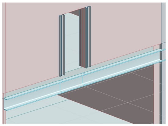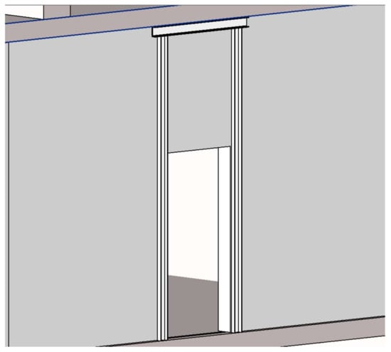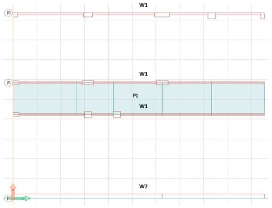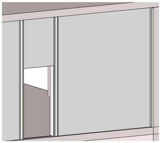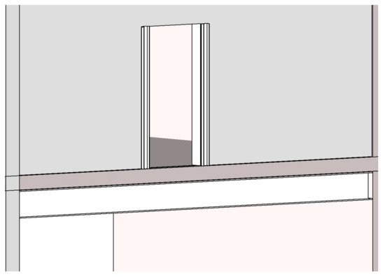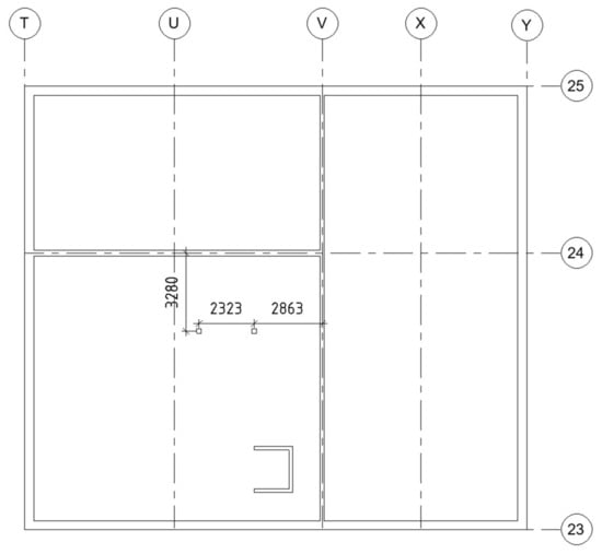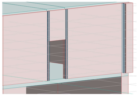 Figure 14 demonstrates the three-dimensional (3D) view of the modeled building. Figure 15 illustrates the building with a section in axis V to elaborate how the area around the EW looks like. The EW is marked with a red frame in the second story (under attic) between axes 24 and 25 with the dimensions of 7.04 × 3.73 m.